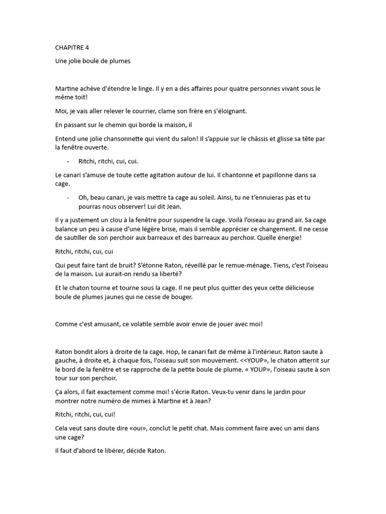 Le chapitre 4 raconte les pitreries de Raton, le chaton curieux, alors qu’il essaie de jouer avec le