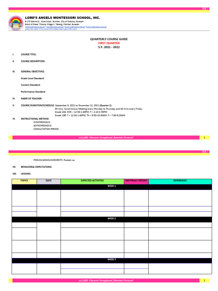 V. COURSE DURATION/SCHEDULE: September 6, 2021 to November 12, 2021 (Quarter 1)