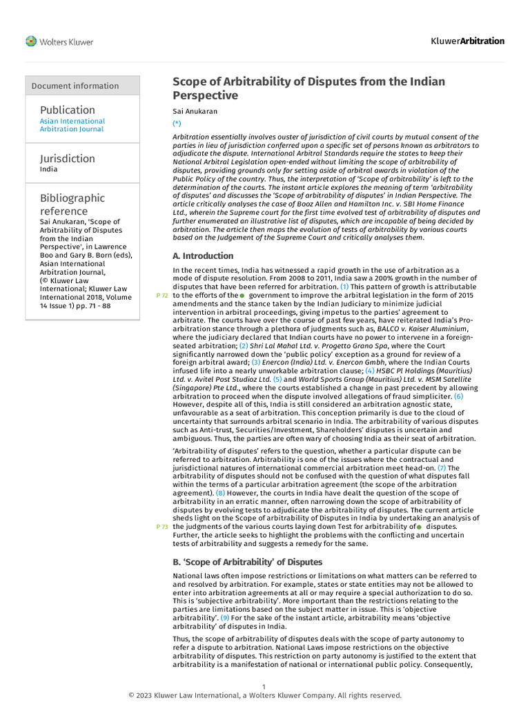 Indian Perspective on Dispute Arbitrability