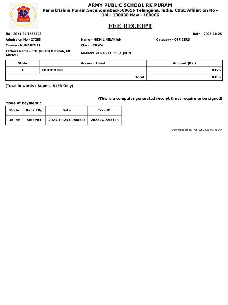 Admission No - 27283 Name - NIKHIL NIRANJAN Category - OFFICERS