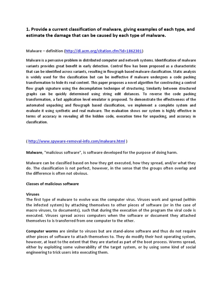 Provide a current classification of malware, giving examples of each type, and estimate the damage that can be caused by each type of malware.