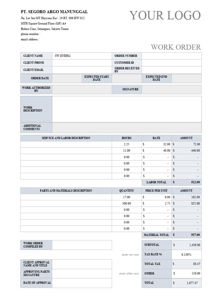 PARTS AND MATERIALS DESCRIPTION QUANTITY PRICE PER UNIT AMOUNT