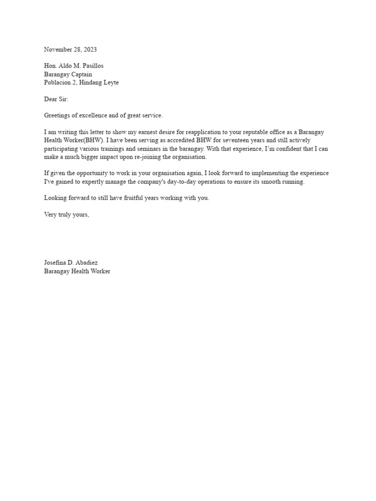 I am writing this letter to show my earnest desire for reapplication to your reputable office as a Barangay