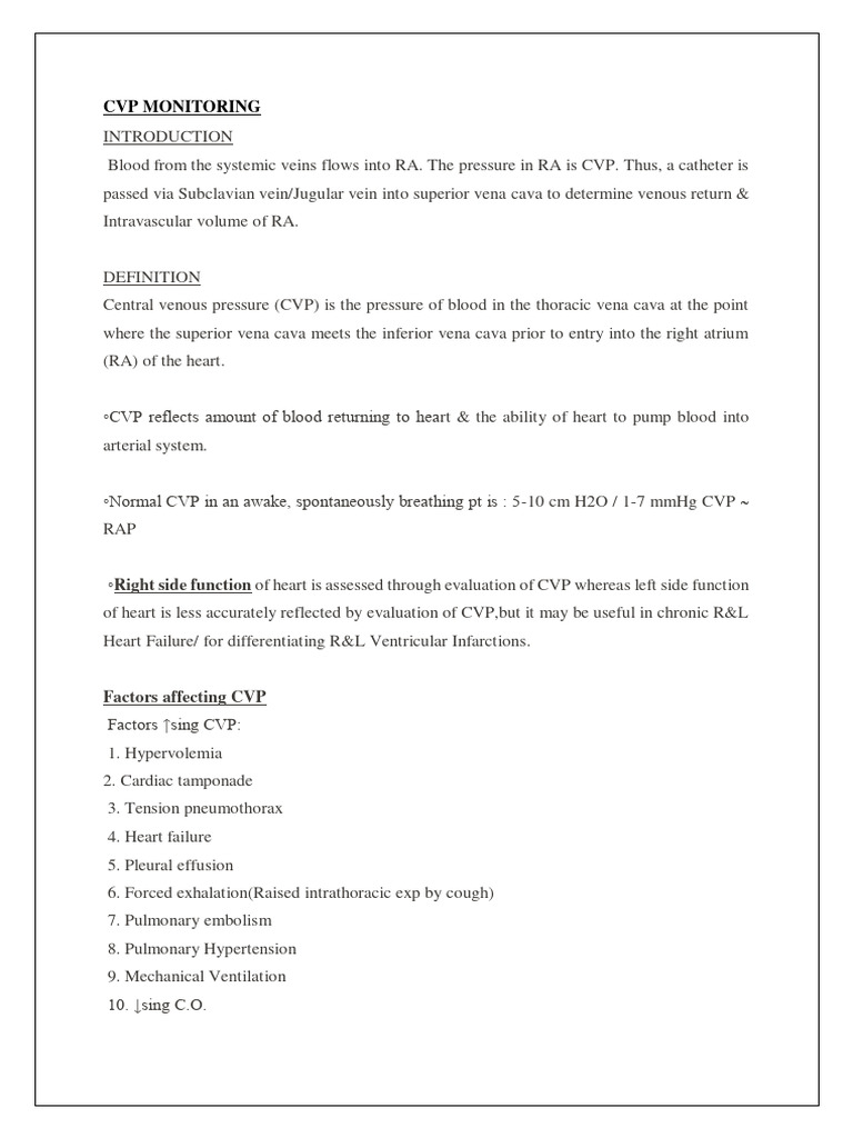 ◦Normal CVP in an awake, spontaneously breathing pt is : 5-10 cm H2O / 1-7 mmHg CVP ~