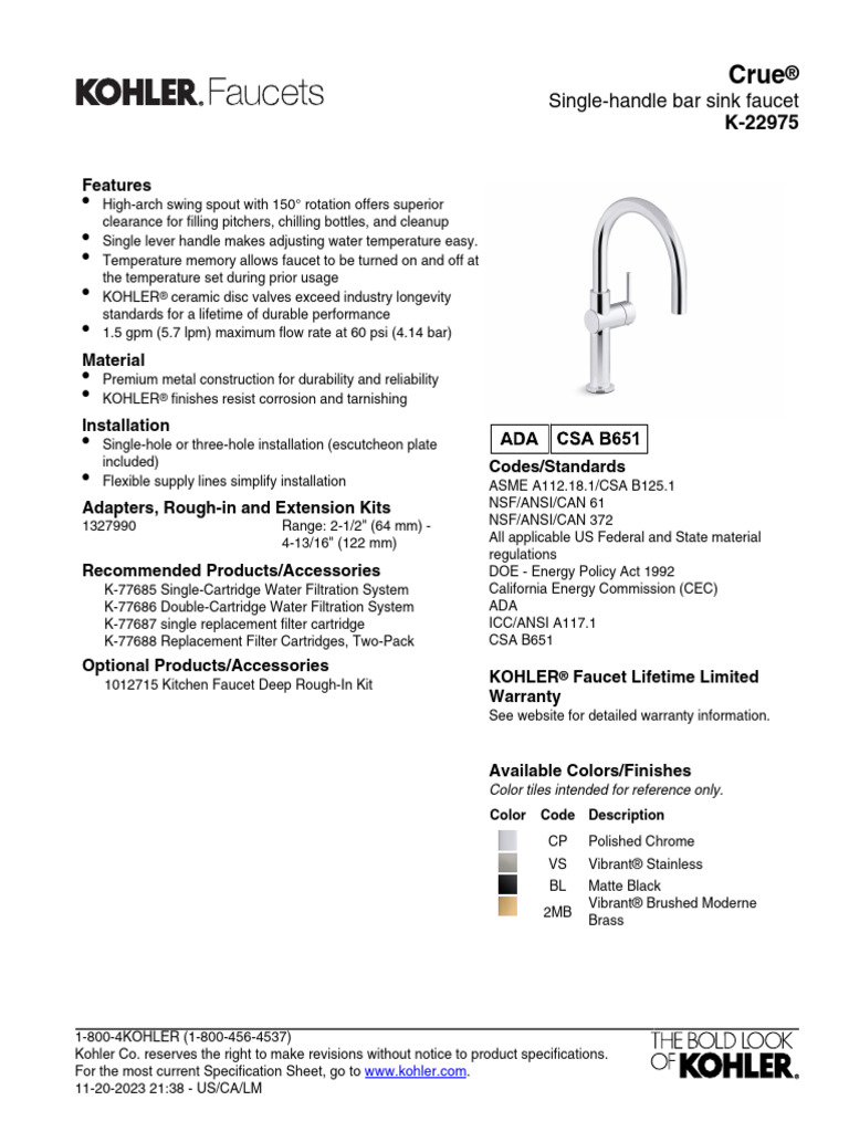 For the most current Specification Sheet, go to www.kohler.com.
