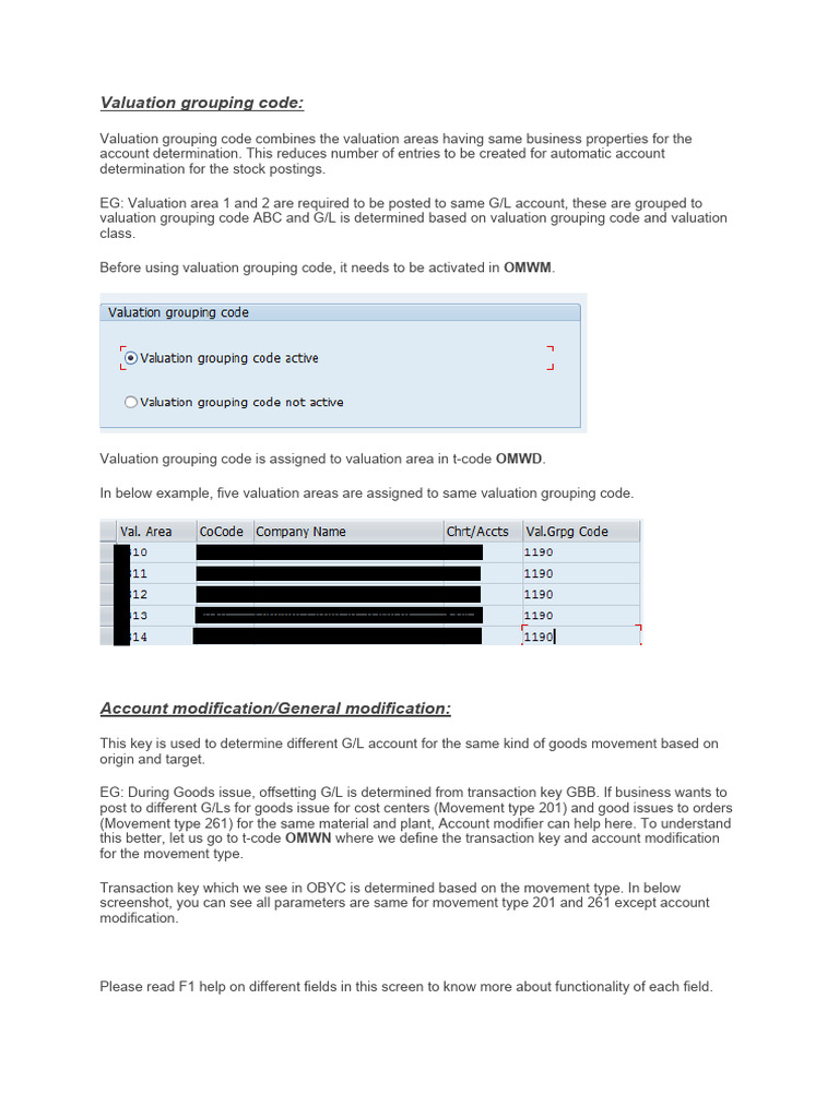 EG: Valuation area 1 and 2 are required to be posted to same G/L account, these are grouped to