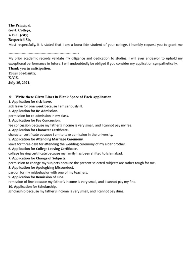 Most respectfully, it is stated that I am a bona fide student of your college. I humbly request you to grant me