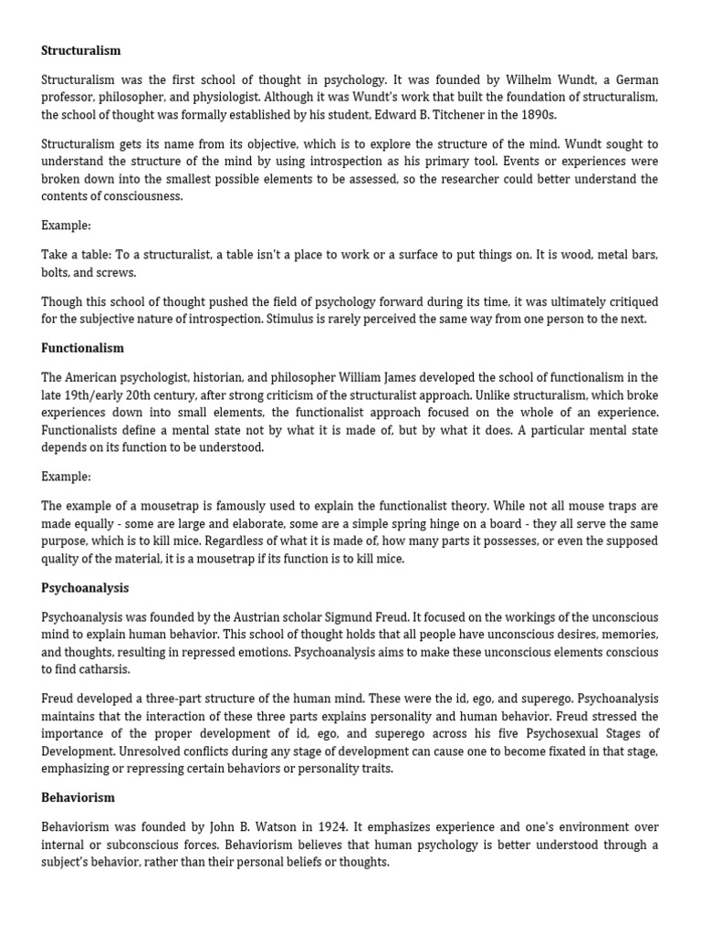 Structuralism was the first school of thought in psychology. It was founded by Wilhelm Wundt, a German