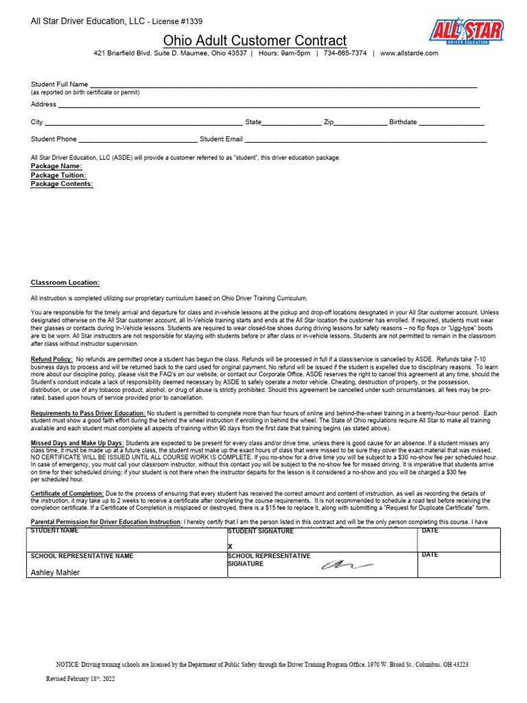 All Star Driver Education, LLC (ASDE) will provide a customer referred to as “student”, this driver education package.