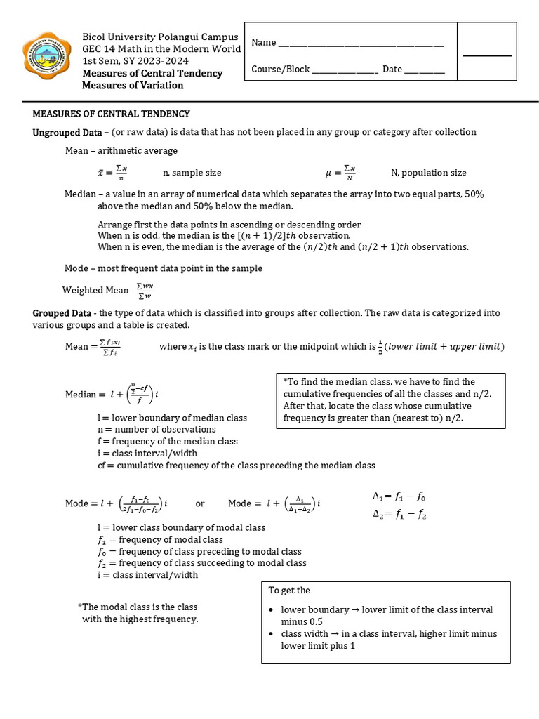 Measures of Central Tendency Course/Block __________________ Date ___________
