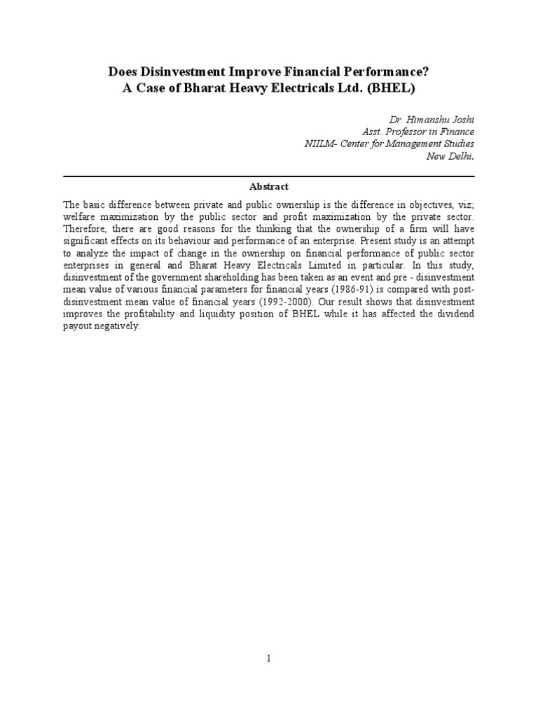 Dr. Himanshu Joshi Asst. Professor in Finance NIILM- Center for Management Studies New Delhi. Abstract The basic difference between private and public ownership is the difference in objectives, viz; welfare maximization by the public sector and profit maximization by the private sector. Therefore, there are good reasons for the thinking that the ownership of a firm will have significant effects on its behaviour and performance of an enterprise. Present study is an attempt to analyze the impact of change in the ownership on financial performance of public sector enterprises in general and Bharat Heavy Electricals Limited in particular. In this study, disinvestment of the government shareholding has been taken as an event and pre - disinvestment mean value of various financial parameters for financial years (1986-91) is compared with postdisinvestment mean value of financial years (1992-2000). Our result shows that disinvestment improves the profitability and liquidity position of BHEL while it has affected the dividend payout negatively.