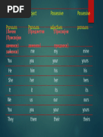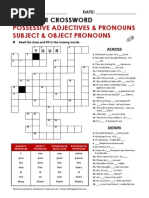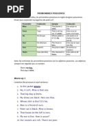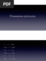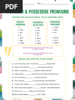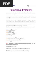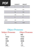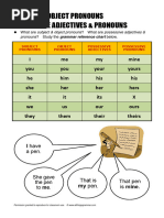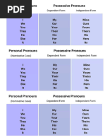 This document is a chart showing different types of personal pronouns in English including subject pronouns, object pronouns, possessive adjectives, and possessive pronouns. It lists the first, second, third person singular and plural forms such as I/me/my/mine for first person singular and we/us/our/ours for first person plural.