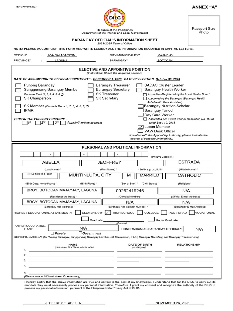 BARANGAY OFFICIAL’S INFORMATION SHEET