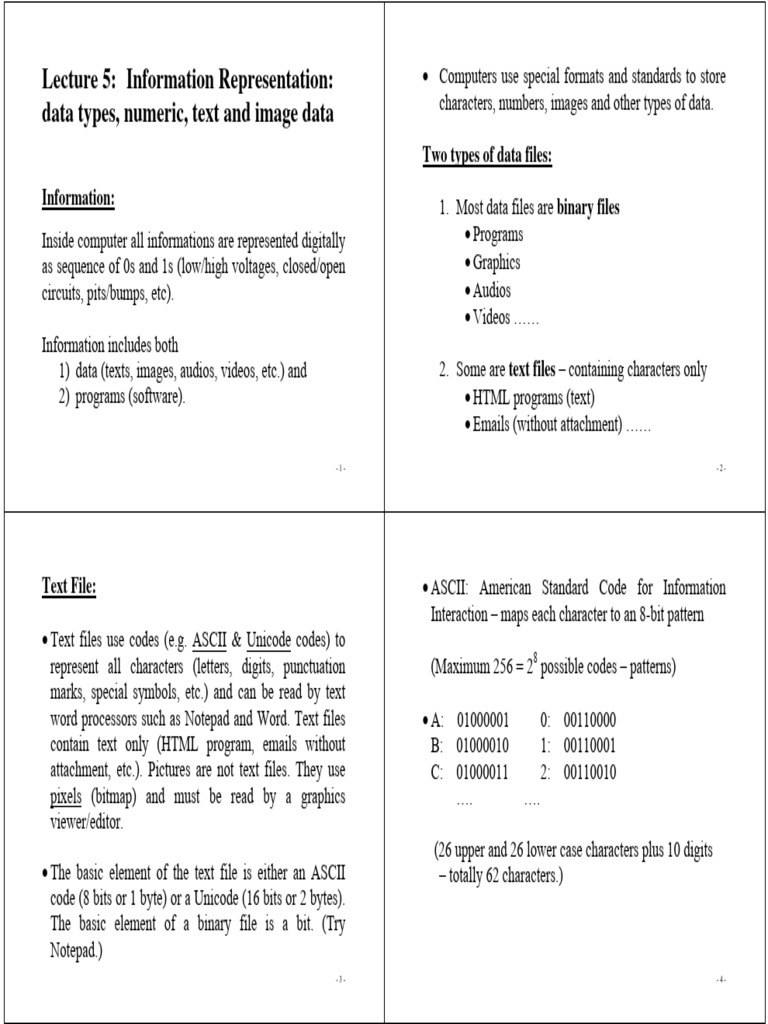 Lecture 5: Information Representation: • Computers use special formats and standards to store