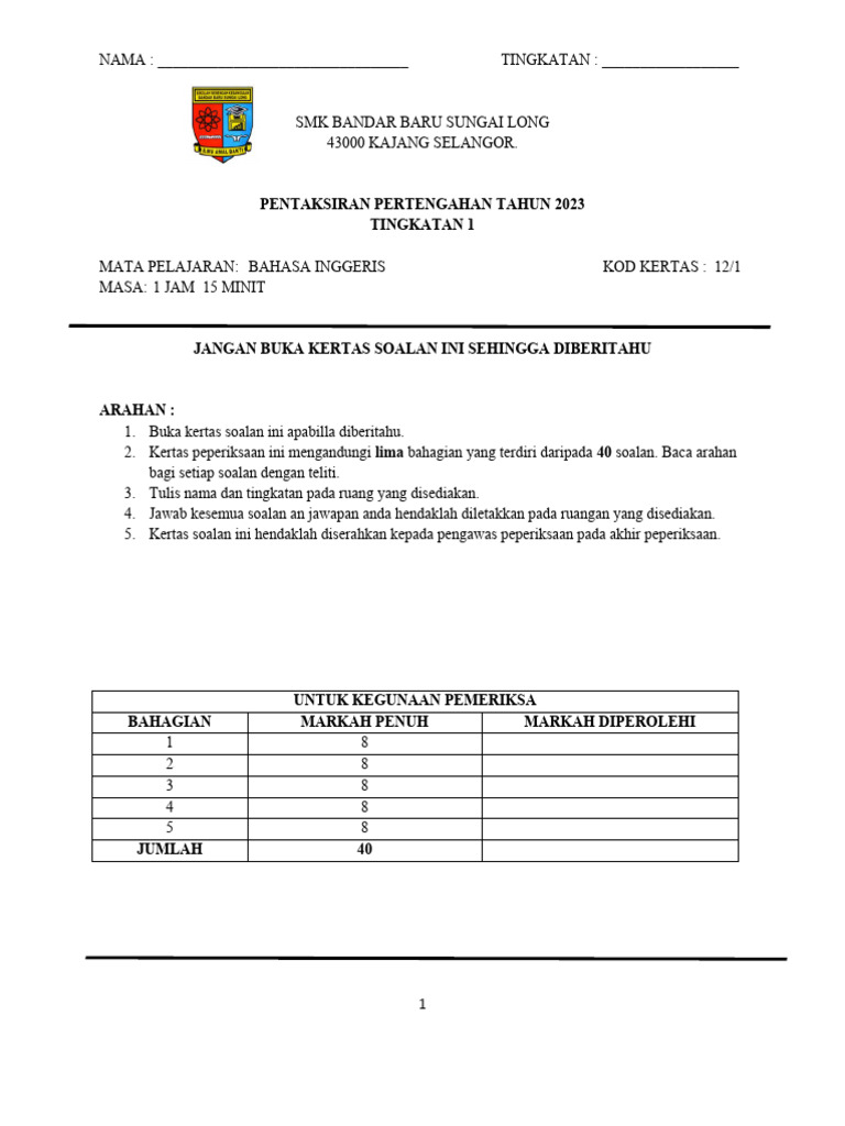 MATA PELAJARAN: BAHASA INGGERIS KOD KERTAS : 12/1