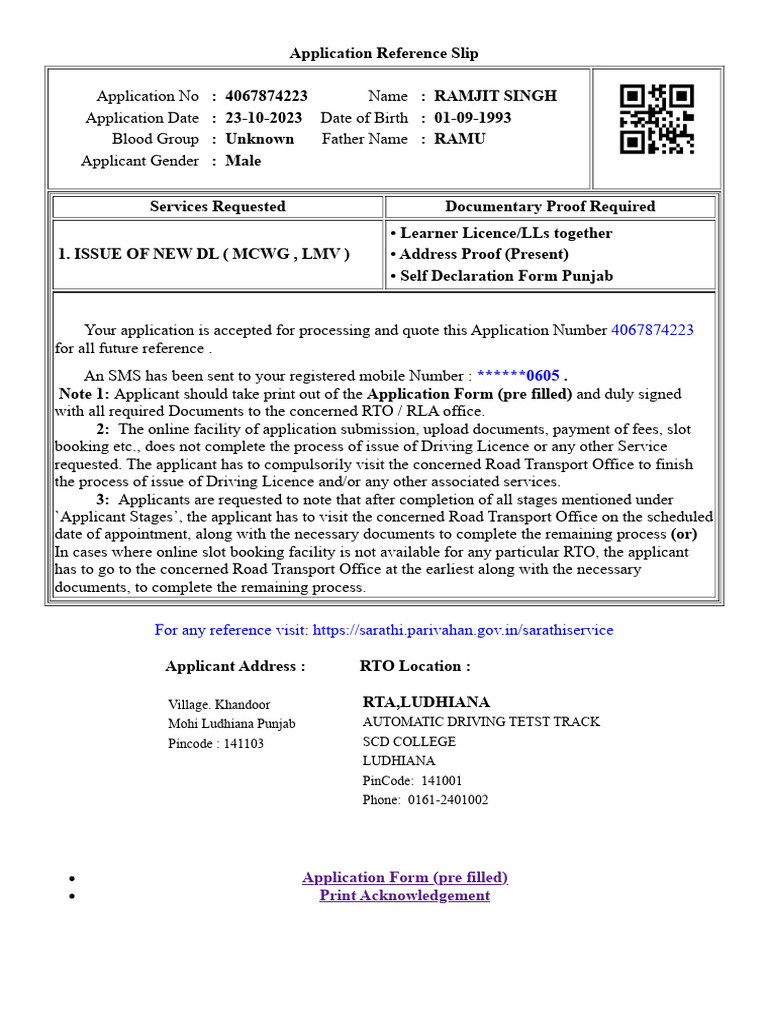 Application No : 4067874223 Name : RAMJIT SINGH