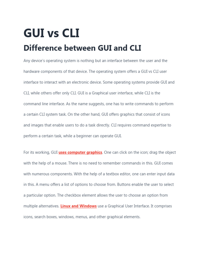 a certain CLI system task. On the other hand, GUI offers graphics that consist of icons