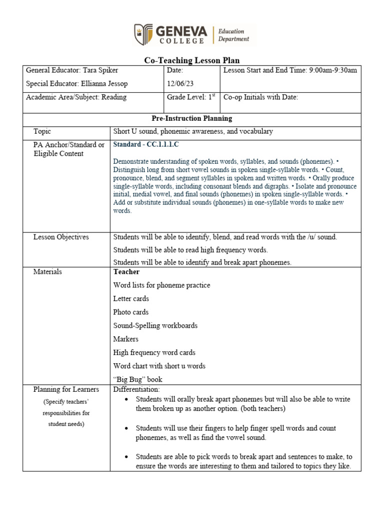 General Educator: Tara Spiker Date: Lesson Start and End Time: 9:00am-9:30am