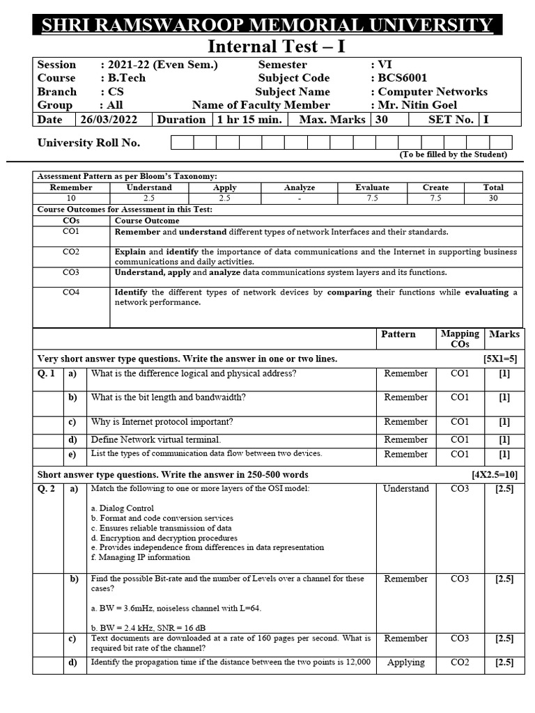 Date 26/03/2022 Duration 1 hr 15 min. Max. Marks 30 SET No. I