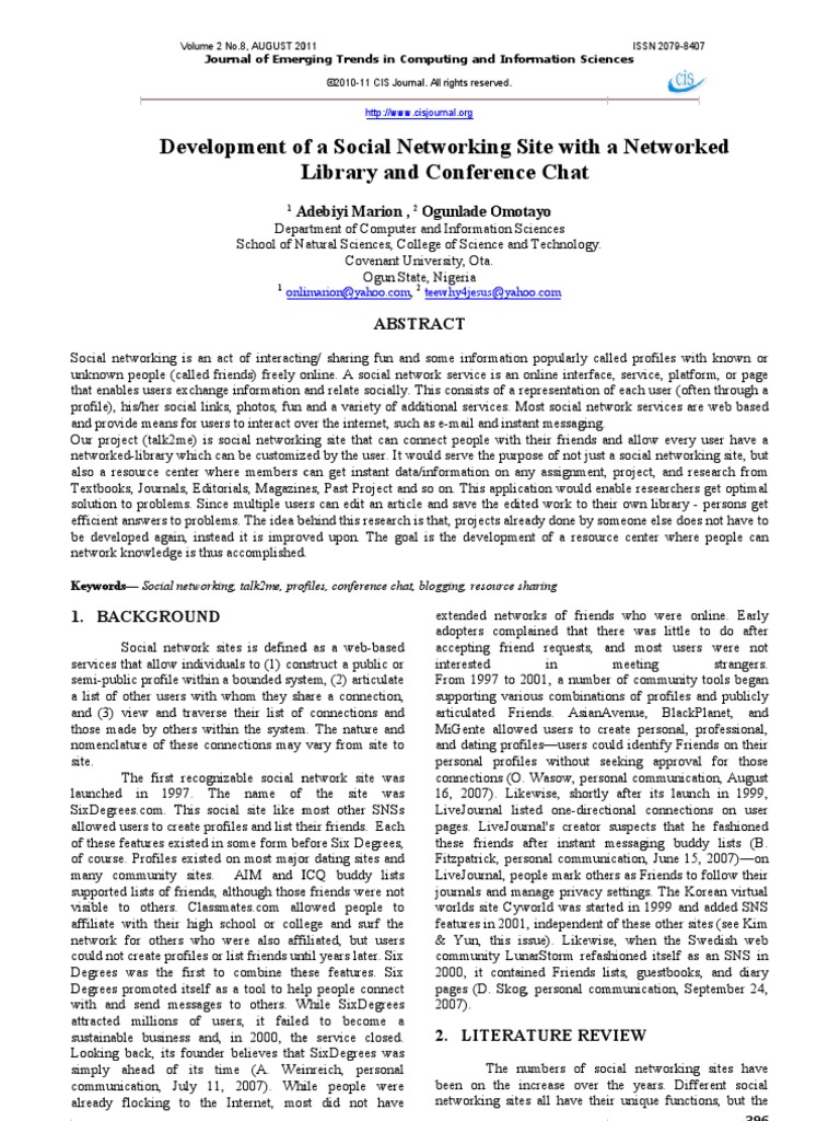 Social network sites is defined as a web web-based services that allow individuals to (1) construct a public or semi-public profile within a bounded system, (2) articulate public a list of other users with whom they share a connection, and (3) view and traverse their list of connections and those made by others within the system. The nature and ers nomenclature of these connections may vary from site to site. The first recognizable social network site was launched in 1997. The name of the site was SixDegrees.com. This social site like most other SNSs allowed users to create profiles and list their friends. Each of these features existed in some form before Six Degrees, of course. Profiles existed on most major dating sites and many community sites. AIM and ICQ buddy lists supported lists of friends, although those friends were not se visible to others. Classmates.com allowed people to affiliate with their high school or college and surf the network for others who were also affiliated, but users could not create profiles or list friends until years later. Six riends Degrees was the first to combine these features. Six Degrees promoted itself as a tool to help people connect with and send messages to others. While SixDegrees attracted millions of users, it failed to become a sustainable business and, in 2000, the service clos closed. Looking back, its founder believes that SixDegrees was simply ahead of its time (A. Weinreich, personal communication, July 11, 2007). While people were already flocking to the Internet, most did not have