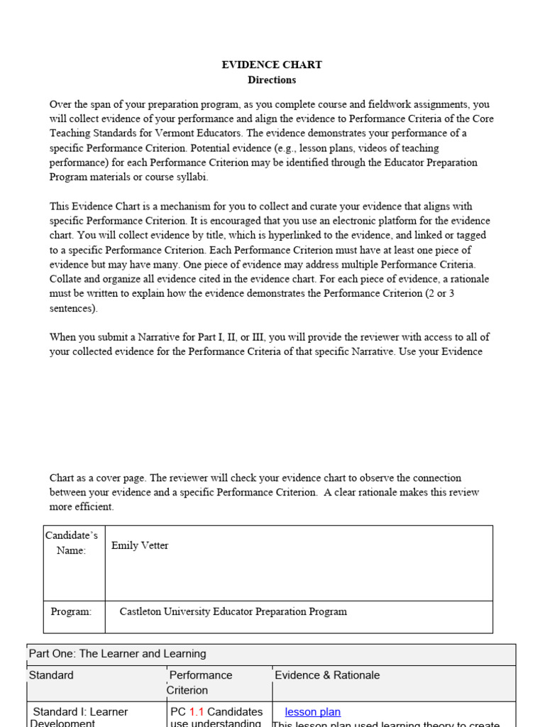 Teaching Standards for Vermont Educators. The evidence demonstrates your performance of a