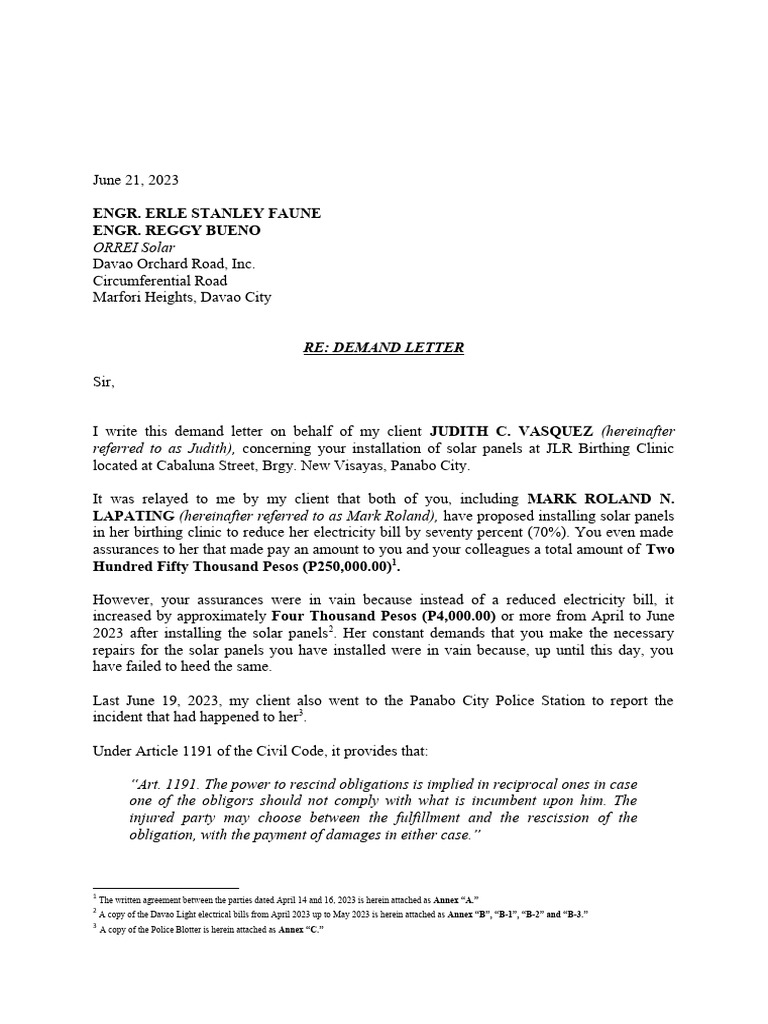 Last June 19, 2023, my client also went to the Panabo City Police Station to report the