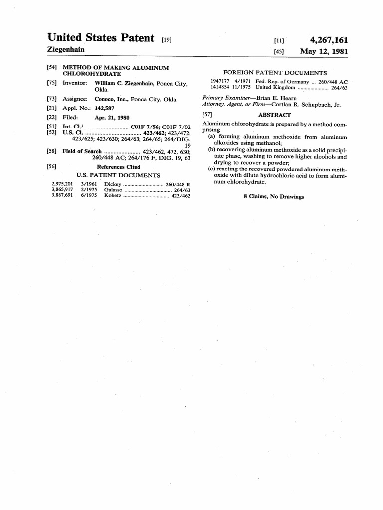 (51 Int. Cl............................. C01F 7/56; CO1F 7/02 Aluminum chlorohydrate is prepared by a method com