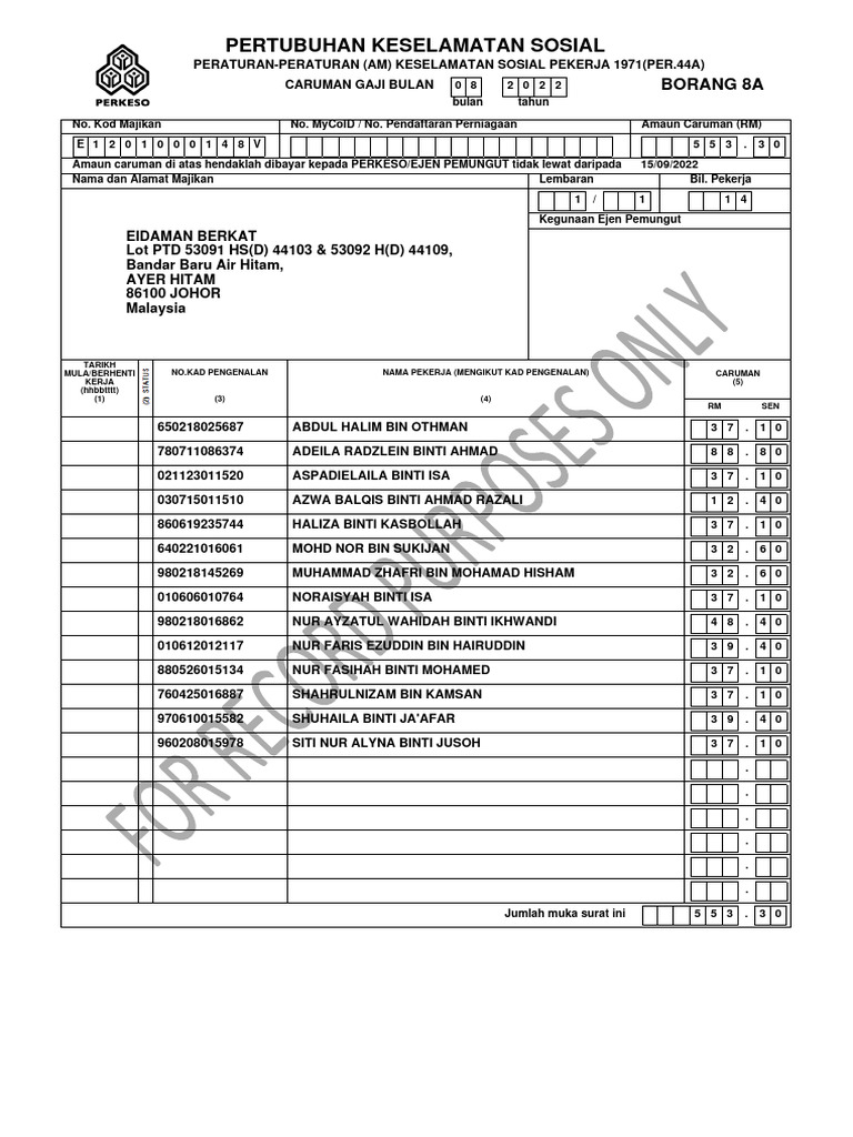 Amaun caruman di atas hendaklah dibayar kepada PERKESO/EJEN PEMUNGUT tidak lewat daripada 15/09/2022