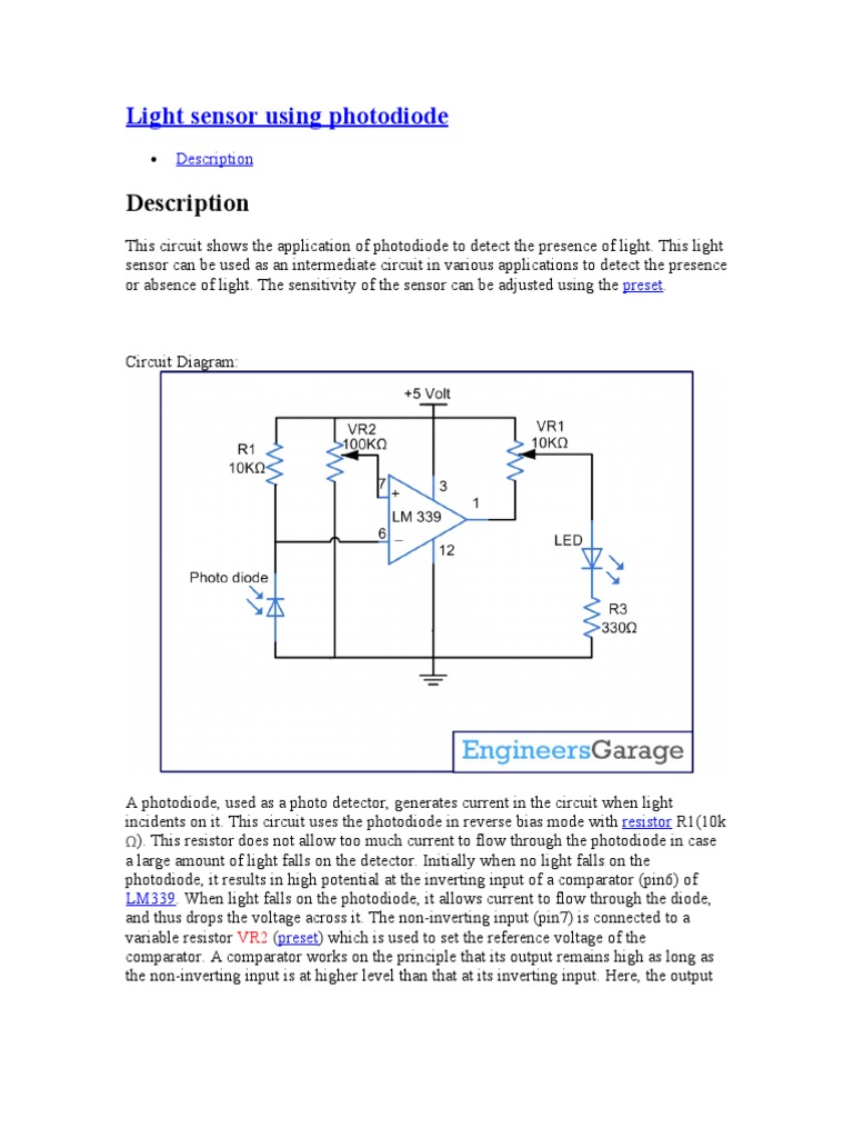 A photodiode, used as a photo detector, generates current in the circuit when light incidents on it. This circuit uses the photodiode in reverse bias mode with resistor R1(10k ). This resistor does not allow too much current to flow through the photodiode in case a large amount of light falls on the detector. Initially when no light falls on the photodiode, it results in high potential at the inverting input of a comparator (pin6) of LM339. When light falls on the photodiode, it allows current to flow through the diode, and thus drops the voltage across it. The non-inverting input (pin7) is connected to a variable resistor VR2 (preset) which is used to set the reference voltage of the comparator. A comparator works on the principle that its output remains high as long as the non-inverting input is at higher level than that at its inverting input. Here, the output