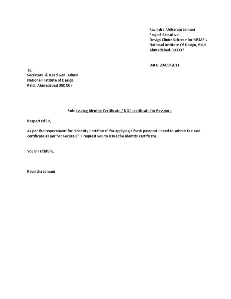 Sub: Issuing Identity Certificate / NOC certificate for Passport. Respected Sir, As per the requirement for Identity Certificate for applying a fresh passport I need to submit the said certificate as per Annexure B. I request you to issue the identity certificate.