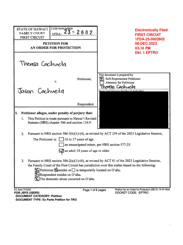 Copy of Theresa Cachuela's temporary restraining order against her estranged husband Jason Cachuela.