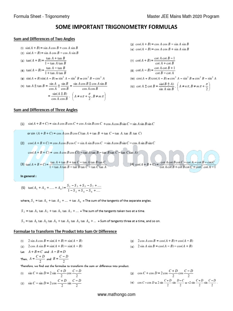 Formula Sheet - Trigonometry Master JEE Mains Math 2020 Program