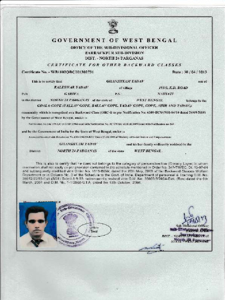 CERTIFICATE FOR OTHER BACKWARD CLASSES