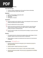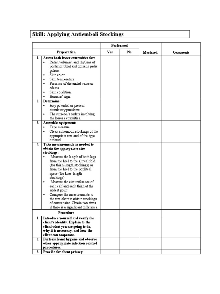 Performed Preparation 1. Assess both lower extremities for: Rates, volumes, and rhythms of posterior tibial and dorsalis pedis pulses. Skin color. Skin temperature. Presence of distended veins or edema. Skin condition. Homans sign. Determine: Any potential or present circulatory problems. The surgeons orders involving the lower extremities. Assemble equipment: Tape measure Clean antiemboli stockings of the appropriate size and of the type ordered Take measurements as needed to obtain the appropriate-size stockings: Measure the length of both legs from the heel to the gluteal fold (for thigh-length stockings) or from the heel to the popliteal space (for knee-length stockings). Measure the circumference of each calf and each thigh at the widest point. Compare the measurements to the size chart to obtain stockings of correct size. Obtain two sizes if there is a significant difference. Procedure 1. Introduce yourself and verify the clients identity. Explain to the client what you are going to do, why it is necessary, and how the client can cooperate. Perform hand hygiene and observe other appropriate infection control procedures. Provide for client privacy. Yes No Mastered Comments