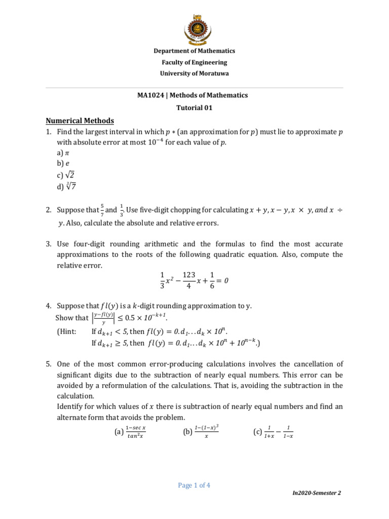 3. Use four-digit rounding arithmetic and the formulas to find the most accurate