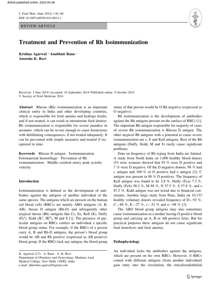 3. Sarkar RS, Philip J, Mallhi RS, et al. Proportion of Rh phenotypes comparison of middle cerebral artery peak systolic velocity and