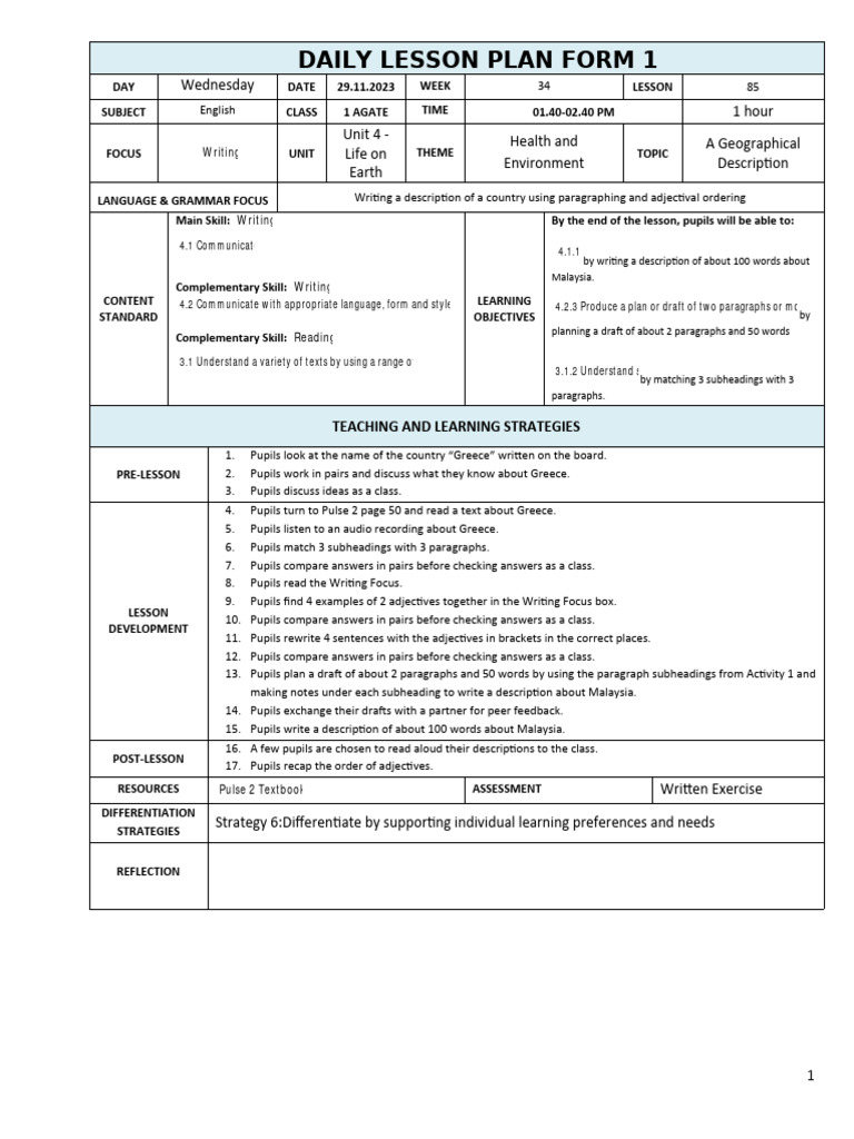 DAY Wednesday DATE 29.11.2023 WEEK 34 LESSON 85
