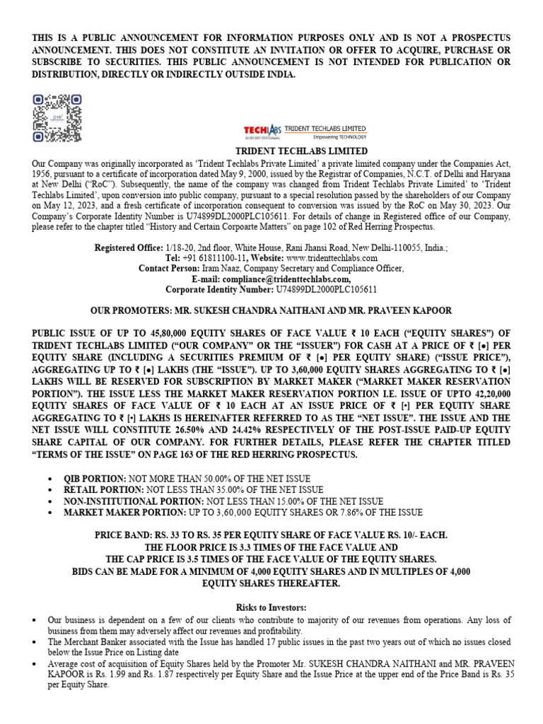 Disclaimer: TRIDENT TECHLABS LIMITED is proposing, subject to applicable statutory and regulatory requirements, receipt of