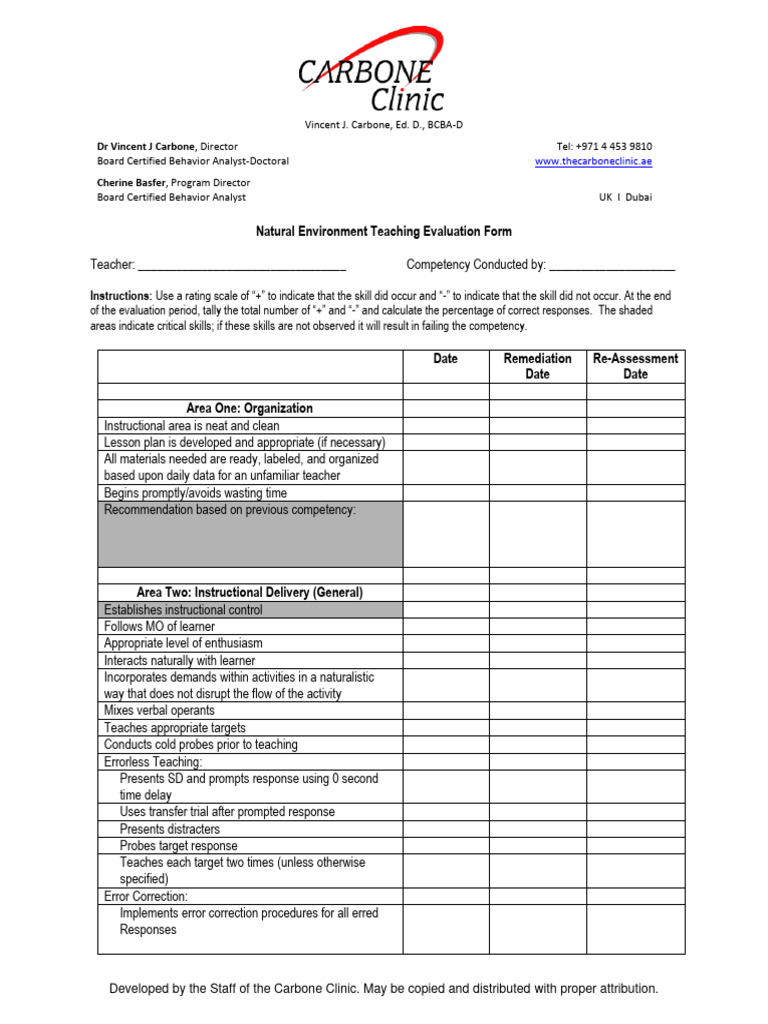 Natural Environment Teaching Evaluation Form