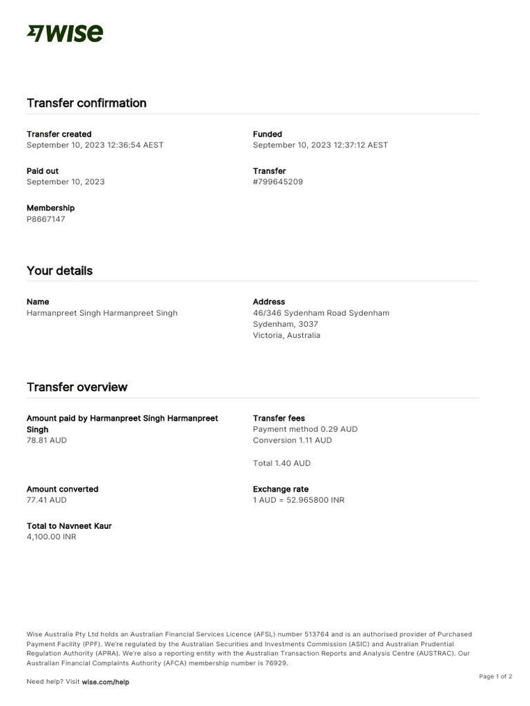 Wise Australia Pty Ltd on behalf of Harmanpreet Local bank transfer