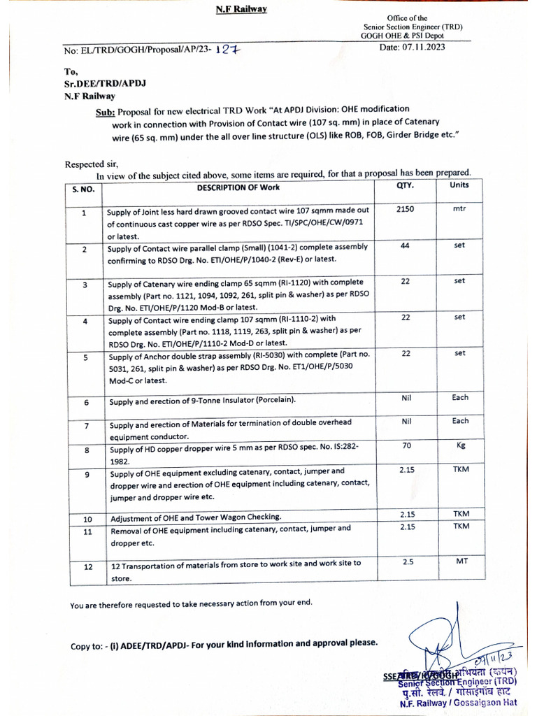 ‘Sub; Proposal for new electrical TRD Work “At APD! Division: OHE modification