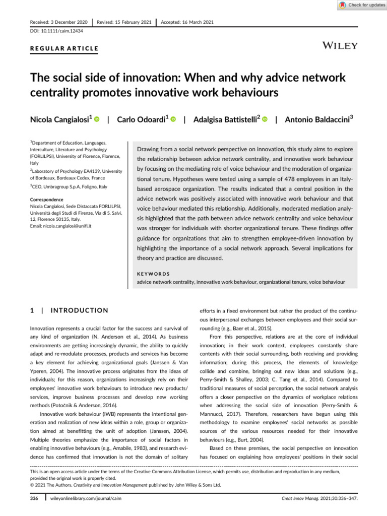 Tang, C., Zhang, Y., & Reiter-Palmon, R. (2020). Network centrality, organizational psychology at the University of Bologna, Italy. Her