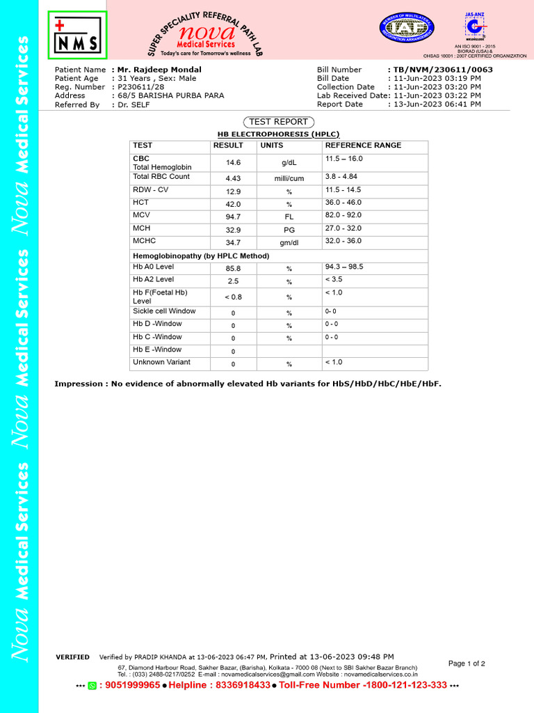 Patient Name : Mr. Rajdeep Mondal Bill Number : TB/NVM/230611/0063