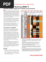 Evaluate cement bond to both pipe and formation Indicate channels or intervals with only partial bond Locate free pipe and top of cement With more than 75 years of experience, Halliburton has the right tools and the superior on-site capabilities to provide reliable cement bond logs in any downhole environment. Full Suite of Tools Halliburton's array of nine dierent CBL tools produce accurate bond logs in any casing size from 2 in. to 20 in. over a wide range of temperatures and pressures. Bond Logs in Hostile and Slimhole Environments Haliburton's Hostile Full Wave Sonic tool can provide reliable bond data in temperatures up to 500F and pressures as high as 25,000 psi. And with an OD of just 2.75 inches, the HFWS is also ideal for slimhole applications. Superior Wellsite Presentations Real-time results can be presented in a variety of formats to match specic wellsite operations. The wellsite engineer can switch between formats during logging for optimal viewing. The cement bond logs shown below utilize acoustic data to determine the degree of cement bonding to the pipe and formation. Primary log presentations include pipe amplitude curves in Track 2 and a MicroSeismogram (MSG) waveform in Track 4. Amplitude curves are used in the calculation of percent of bond to the pipe while the MSG reveals qualitative information on both the pipe and formation bond.
