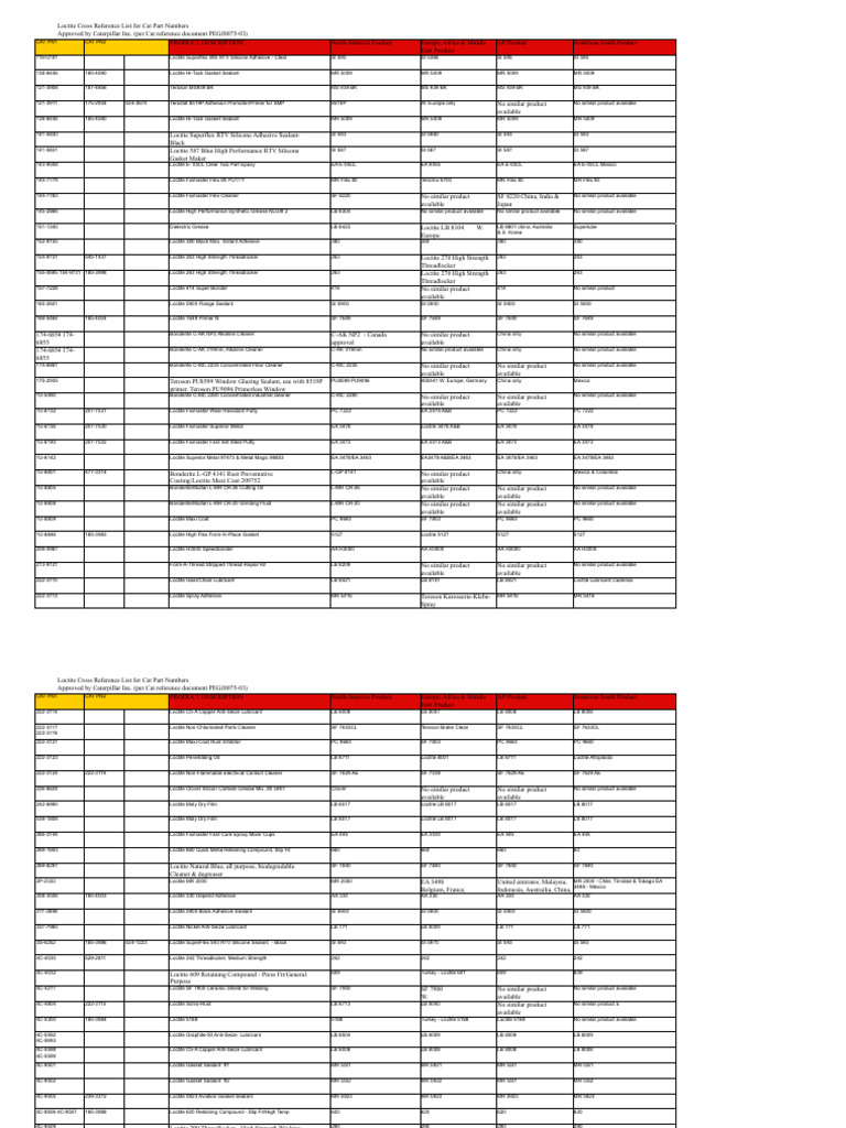 Loctite Cross Reference List for Cat Part Numbers