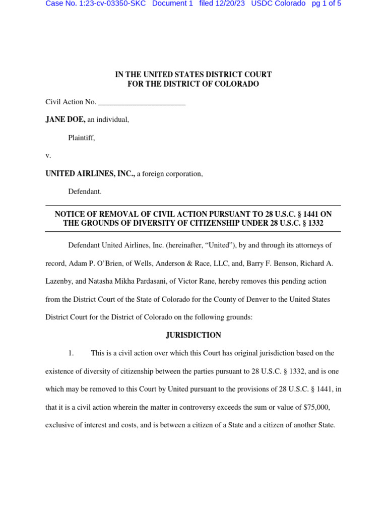 3. On October 27, 2023, there was filed in the District Court of the State of Colorado for the County of Denver, the attached complaint and summons, respectively, bearing Case No. 2023CV33171 in the records and files of that court. A true and correct copy of the complaint filed in the state court and served on United is attached as Exhibit “A.” 4. United was served with Plaintiff’s Complaint on November 20, 2023. A true and correct copy of the proof of service of summons is attached hereto as Exhibit “B.” 5. Accordingly, the time for removal as set forth in 28 U.S.C. § 1446(b)(3) has not yet elapsed. 6. On December 12, 2023, United filed its answer to Plaintiff’s complaint in the District Court of the State of Colorado for the County of Denver. A true and correct copy of the answer filed in the state court is attached as Exhibit “C.” 7. This is a civil action by plaintiff Jane Doe (hereinafter, “Plaintiff”) against United. Plaintiff seeks damages for injury she allegedly sustained as a passenger on United Airlines Flight UA 1520 from Orlando, Florida to Denver, Colorado on or about October 2, 2022. 8. The Court has original jurisdiction based on the existence of diversity of citizenship between the parties pursuant to 28 U.S.C. § 1332, wherein the matter in controversy exceeds the sum or value of $75,000, exclusive of interest and costs, and is one which may be