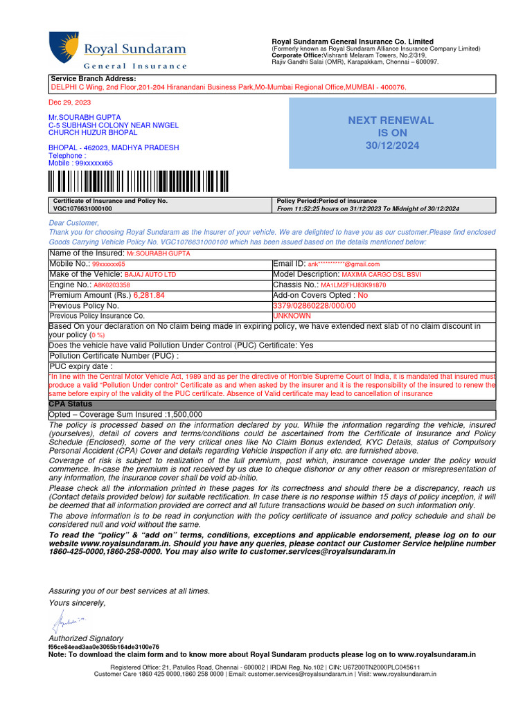 Thank you for choosing Royal Sundaram as the Insurer of your vehicle. We are delighted to have you as our customer.Please find enclosed