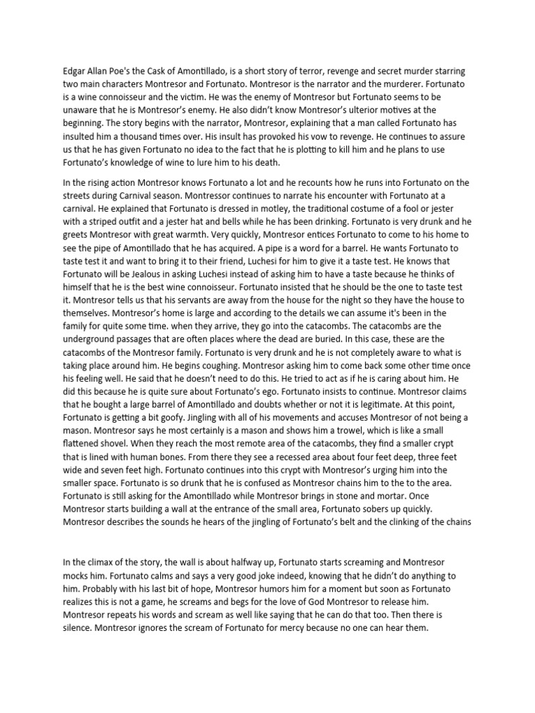 Edgar Allan Poe's the Cask of Amontillado, is a short story of terror, revenge and secret murder starring