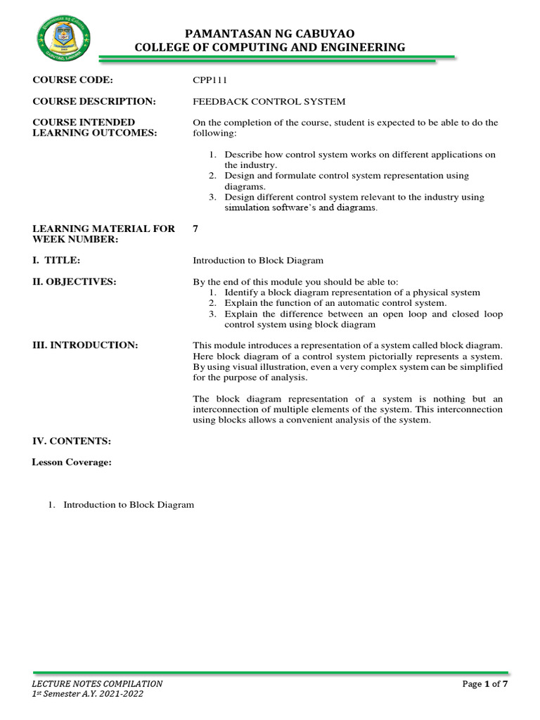 III. INTRODUCTION: This module introduces a representation of a system called block diagram.