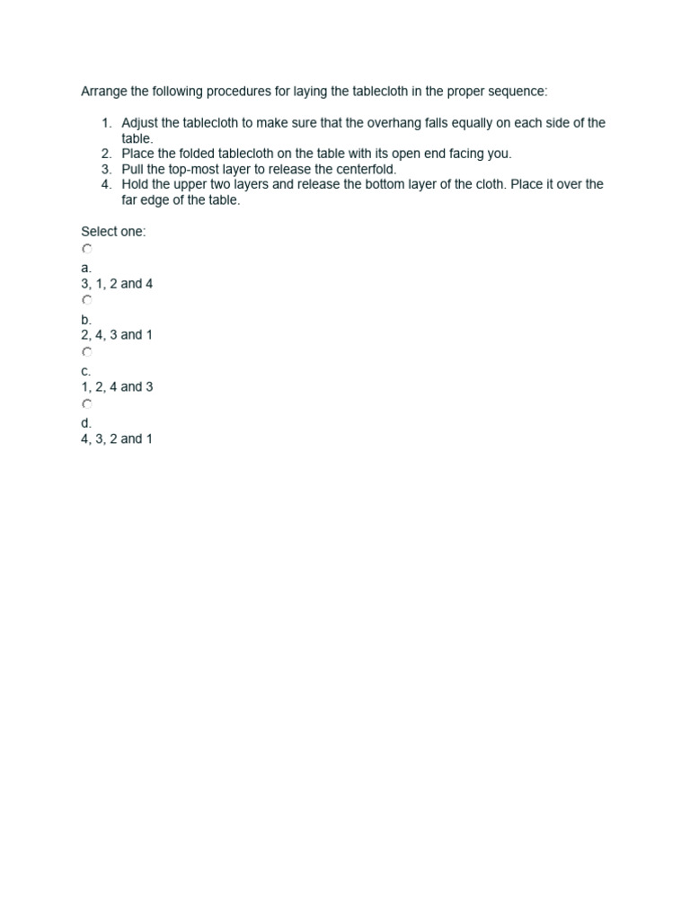 Arrange the following procedures for laying the tablecloth in the proper sequence: